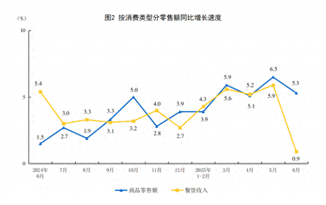 按消费类型分,6月份,商品零售额37580亿元,同比增长5.3%;餐饮收入4708亿元,增长0.9%。1—6月份,商品零售额217978亿元,增长5.1%;餐饮收入27480亿元,增长4.3%。