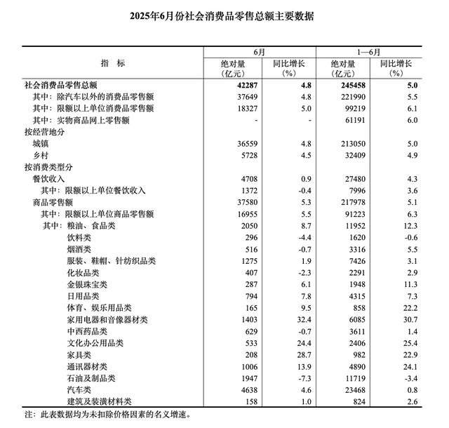 6月份,社会消费品零售总额42287亿元,同比增长4.8%。其中,除汽车以外的消费品零售额37649亿元,增长4.8%。